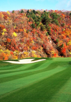 安達太良連峰の紅葉に抱かれる丘陵舞台。豪快に振れるロング、池越えショートの緊張と高揚、どちらも秋空に映える!色彩に背中を押されるように一打が伸び、ドラマチックな18ホールを満喫