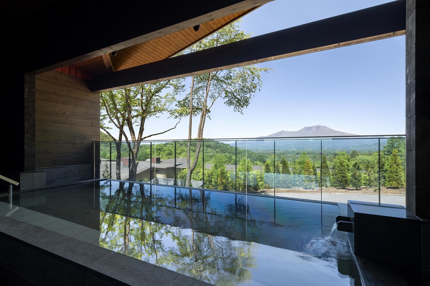 ホテルから温泉棟へモノレール約1分。大窓からの眺望自慢の内湯と露天、サウナと水風呂が魅力。