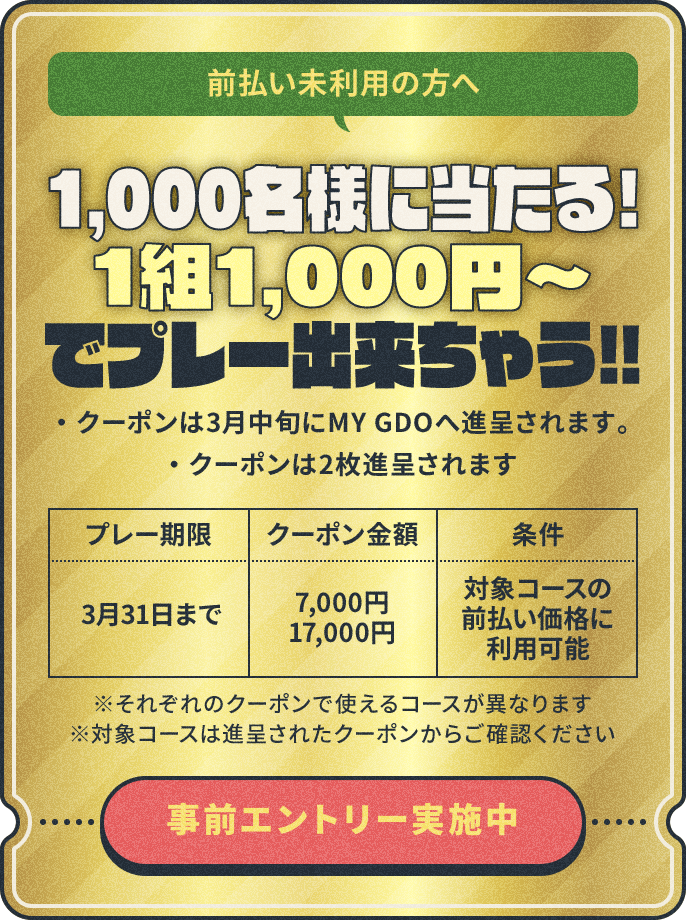 本キャンペーンにエントリー&3月6日(金)までに「GDOゴルフ場予約」「GDOゴルフショップ」のメールマガジンを受け取るに設定した方の中から、20名に無料プレー相当クーポン(上限3万円)が当たります。 |