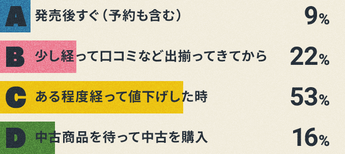 - 定評のあるモデルが型落ちした際に安く購入するのが満足度が高いので