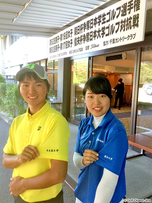 団体戦に出られない二人は、個人戦の朝日杯が終わった26日、仲良くクルマで名古屋に帰っていきました。「6時間かかるんですよ。でも二人一緒だからまだいいです」と上田くん。従兄弟なんですね、彼らは。ジュニア時代は親御さんがゴルフ場送迎作戦で大わらわですが、大学生は、自分で移動できちゃう。成長しましたねー、という話なのです。