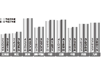 一般社団法人日本ゴルフ場経営者協会が発表した「ゴルフ場利用税の課税状況からみたゴルフ場の数・利用者数等」の平成27年度(3月〜平成28年2月)データを集計した。