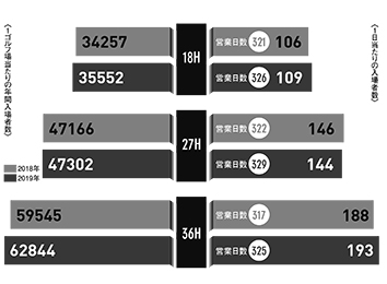 2019年は、暖冬で春は好天に恵まれたが、9〜10月にかけての台風によって、関東を中心に大きな被害を受けた。ゴルフ場の集客にはどのような影響があったのか、19年の年間入場者数を調査した