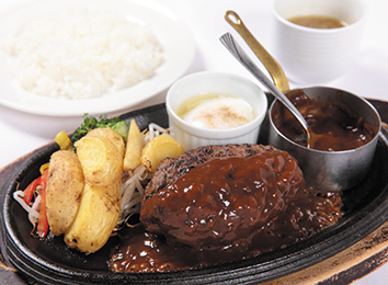 1個ずつ丁寧に仕込んで作る国産合挽肉190gのハンバーグは、厚みがあり食べ応えも抜群。ヴァンルージュ(赤ワインソース)仕立てで、奥深い甘さが特長のデミグラスソースが旨味をさらに際立たせる。