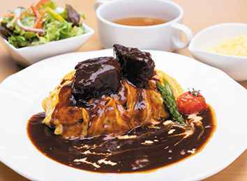 とろとろ卵のオムライスと、4〜5時間かけてじっくり煮込んだ濃厚なビーフシチューがよく合う一品。卵の上に載った2個の牛肉(1個当たり約50g)がボリューム感を引き立たせる。女性向けに考案されたメニューだが、男性にも人気が高い。限定メニュー(1日5〜10食)で、事前予約も可能。