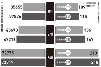 ゴルフは感染リスクの低いスポーツとの認識が広く周知され、若年層や女性の新規ゴルファーが増えている。ゴルフ場はどうなのか、21年の年間入場者数を調査した。コロナ前後での推移を調べるため、19年を比較対象としている。
