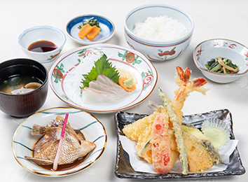玄界灘で獲れる新鮮な真鯛を、刺身とアラ煮の両方で思う存分に堪能できる。さらに、魚介類(エビ、キス、イカ)と旬の野菜の天ぷら(現在はカボチャ、インゲン、タラの芽)まで同時に味わえる、まさしく不動の人気No.1メニュー。