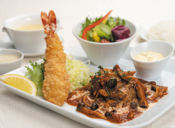 3種類のきのこと香味野菜で煮込んだトマトソースベースの手ごねハンバーグと、特大サイズの揚げたてエビフライがセットになった人気No.1ロングセラーの「クラブランチ」。サラダにかける自家製オニオンドレッシングにもこだわっている。