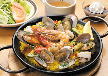 「魚介のパエリア」。約5年前に料理長が若年層・女性向けに開発したチャレンジメニュー。有頭エビやイカ、ムール貝などの魚介の風味が口一杯に広がる。本格的な味わいに口コミで高評価が拡散。現在では老若男女を問わず人気メニューの1つに。