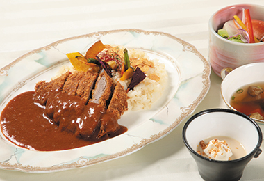 1番人気の「ガーリックライス牛カツレツ添え」。自家製ガーリックライスに柔らかな牛ヒレカツを合わせ、特製デミグラスソースでいただくボリューム満点の一品。ライスの上に盛られたドライ野菜はヘルシーで、様々な食感のアクセントも楽しめる。