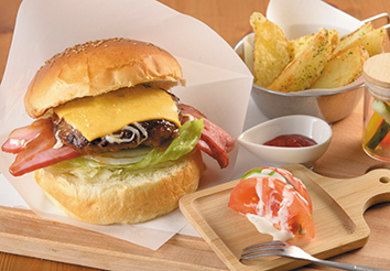料理長イチオシの「甲州ワインビーフ100%てりやきバーガー」は、きめ細かい柔らかさと、ほんのりした甘みが特徴の「甲州ワインビーフ」を100%使用したパテに、厚切りベーコン、新鮮なレタスや玉ねぎ、濃厚チーズを特注バンズでサンドした和風てりやきベースの本格グルメバーガー。