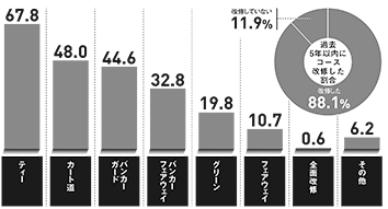 クラブやボールの進化でゴルファーの飛距離が伸び、フェアウェイバンカーが設計時の想定どおりに戦略上の機能を果たせず、初心者や飛距離の出ない人に対するハザードになっている場合がある。また、近年は初心者や女性も気軽に楽しめるように前方にティーを新設するゴルフ場も増えている。そこで、今回はティーとバンカーの改修について調査した。
