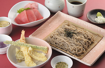 天ざる蕎麦御膳。ざるそば、蕎麦は長野県の製麺所から取り寄せ、天ぷらは、エビ(通年)と旬の魚や野菜を使用。セットの「ミニ鉄火丼」はミニ鮪山かけ丼」または「ミニソースメンチカツ丼」に変更可