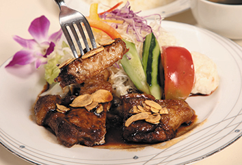 青山高原トンテキセット。真珠貝の微粉末を飼料に育てられた地元のブランド豚「伊勢志摩パールポーク」を使用したトンテキ。柔らかく臭みがないのが特長で、口どけがよくさっぱりとした脂肪には、ほのかな甘みがありしつこさも皆無。和風ベースのオリジナルソースで食欲が倍増する。