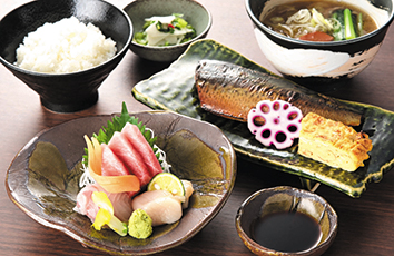 宍戸和食膳。焼き魚、旬の刺身3点盛り、具だくさんのけんちん汁を同時に食べられる和食膳。使用する食材は、季節や旬によって変更しており、11月末現在は、焼き魚が国産秋サバの幽庵焼き、刺身はトロ、タイ、ホタテの3種。