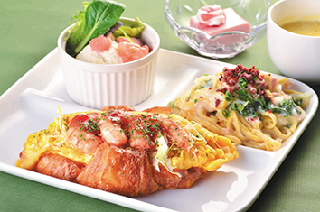 2024春の洋食プレート。ボリューム控えめながら20種類以上の食材を使用している。4〜5年前から提供していたレディスメニューを2年ほど前に季節のプレートに変更。今春は、チーズオムレツのクロワッサンサンドと桜エビと菜の花のクリームパスタ、明太子ポテトサラダ、スープ、甘味がセットになっている。