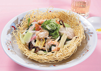パリパリ麺の皿うどん。豚肉、魚介類、野菜などバラエティ豊かでたっぷりな食材は自家製タレと絡め、本場長崎から取り寄せた麺は、器状に1枚ずつ丁寧に揚げることで、見た目もアーティスティックでインパクトのある一品になっている。