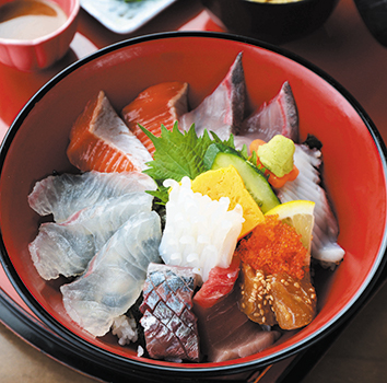 飛切海鮮丼。マグロ、タイ、カンパチ、サーモンなど、脂の乗った鮮度抜群の獲れ立て魚介類を心ゆくまで堪能できる。見た目の鮮やかなとびっこ(トビウオの卵)のプチプチとした食感がよいアクセントになっている。