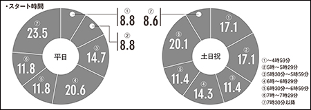 日照時間の長い夏季は、早朝プレーや薄暮プレーなどを行っているゴルフ場は多い。また、近年は猛暑により、スタート時間を早めたり、時間帯別料金を設定するゴルフ場が増えている。そこで今回は、夏季のスタート時間と料金について、初めて調査した。
