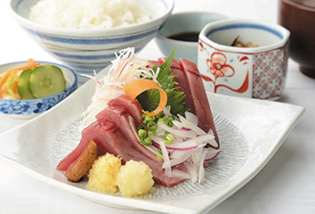 かつおの刺身定食。秋が旬の生の戻りかつおは、冷凍では味わえない脂ののりと、もっちりとした食感が堪能できる。来場時に予約する人が多数。