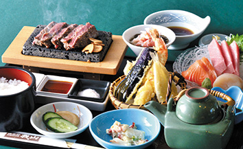 厳選食材を使用した「我山御膳」。上州牛サーロインステーキ、刺身3点盛り、天ぷら盛合せ、蟹もずく酢、小鉢、土瓶蒸し、ご飯、香の物が並ぶ豪華絢爛な品揃え。接待時やコンペ開催時のランチメニューに最適。