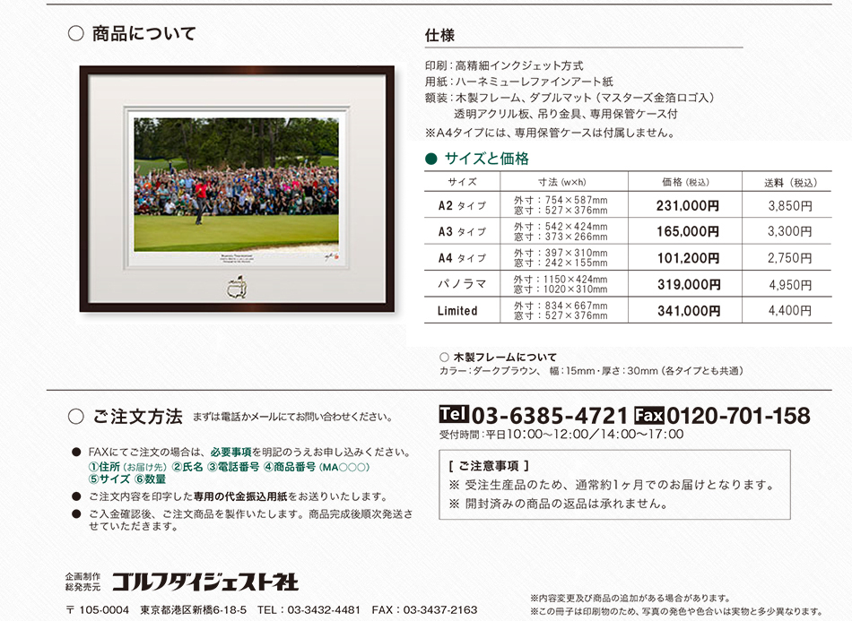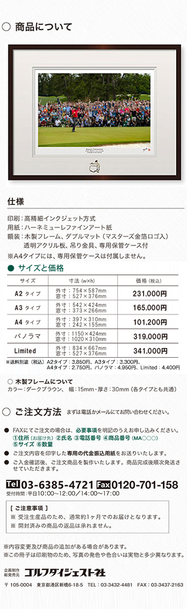 ゴルファーにとって特別で憧れのマスターズ。あの感動をご自宅のリビングや会社の応接間に飾ってはいかがでしょうか。