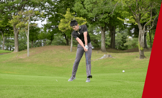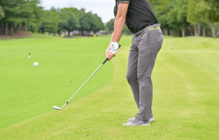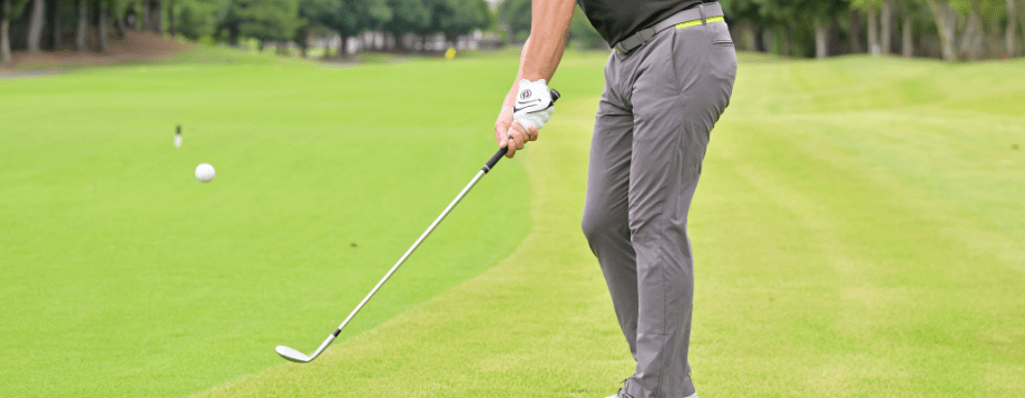 アプローチでもひざの動きは重要です。ダウンスイングで左ひざが伸びることで、腰の回転がスムーズになります。良いタイミングで、正確なショットを打つためにも、ひざの動きが大事なのです。
