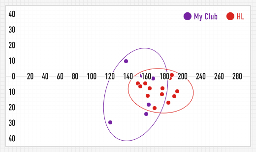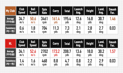 マイクラブとの飛距離データを比較してみると、ボール初速は50.6m/sから52.6m/sにアップ。キャリーは161ヤードから173ヤードに伸び、ミート率も1.46から1.57と上昇した。